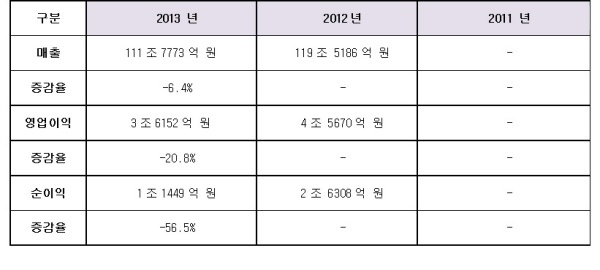 영업이익 역시 2013년 약 3조 6152억 원으로, 전년 대비 20.8% 감소했다. 또한 순이익은 2013년 약 1조 1449억 원으로, 전년대비 약 56.5%나 감소했다.