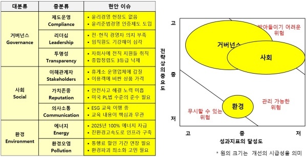 △거버넌스(Governance·지배구조)=거버넌스는 ESG 경영헌장을 제정하지 않은 것은 다른 공기업과 동일하지만 막대한 부채와 경영부실를 해결하려는 의지가 부족한 것으로 평가된다.