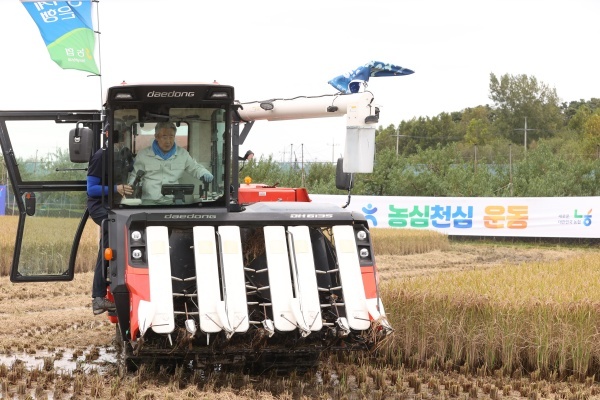▲ 10월17일 세종시 농어민문화체육센터 일대에서 벼 수확작업을 시연하고 있는 강호동 농협중앙회장 [출처=농협경제지주]
