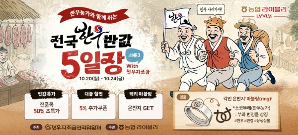 농협중앙회(회장 강호동) 농협경제지주(축산경제대표이사 안병우)에 따르면 2025년 10월20일(월)부터 24일(금)까지 「전국 한우 반값 5일장」행사를 개최한다.