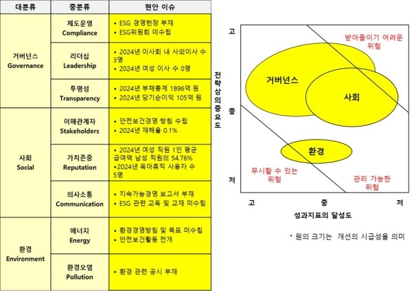 △거버넌스(Governance·지배구조)=거버넌스는 상장기업이라는 지위에 어울리지 않게 ESG 경영에 대한 준비는 전혀 하지 않아 개선이 시급하다고 평가했다.