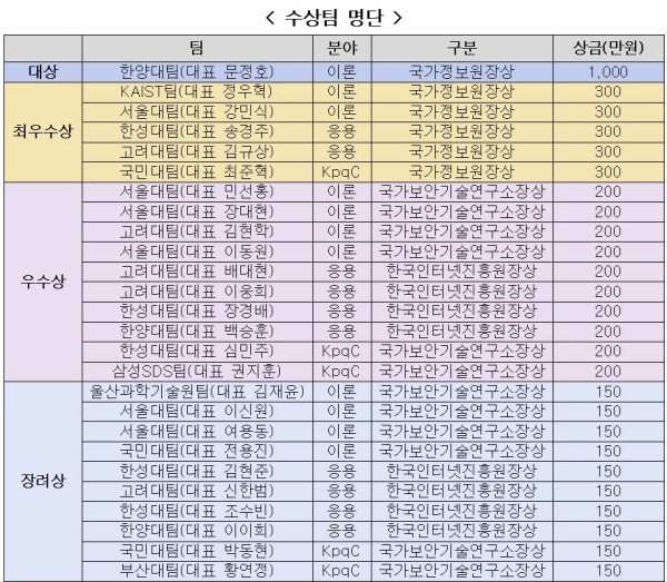 학계 전문가 32명으로 구성된 심사위원회는 1차 서면심사·2차 심층인터뷰를 거쳐 △‘암호 이론’ 분야 19팀 △‘암호 응용’ 분야 19팀 △‘양자내성암호’ 분야 7팀 등 총 45개 팀을 최종 수상팀으로 선정했다.
