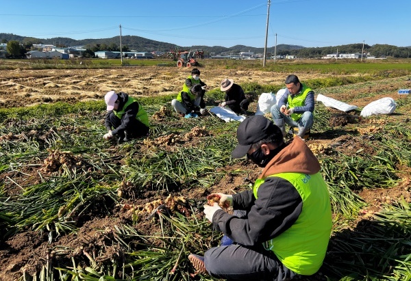 이날 봉사활동에 참여한 축산유통부 직원 10여 명은 출하를 앞둔 생강 농가를 위해 수확부터 선별, 운반 등 농작업을 진행했다. 농가 주변 배수로의 퇴적토와 잡초제거 등 환경개선에도 힘을 보탰다.