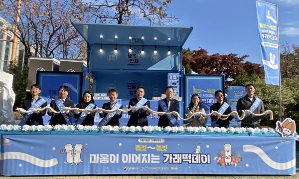 ▲ 농협경제지주, 11월11일(화) 여의도공원에서 가래떡데이를 맞아 '쫄깃쫄깃 마음이 이어지는 가래떡데이' 실시(이천일 품목지원본부장(왼쪽 5번째), 이정훈 양곡부장(4번째) 등 관계자) [출처=농협경제지주]