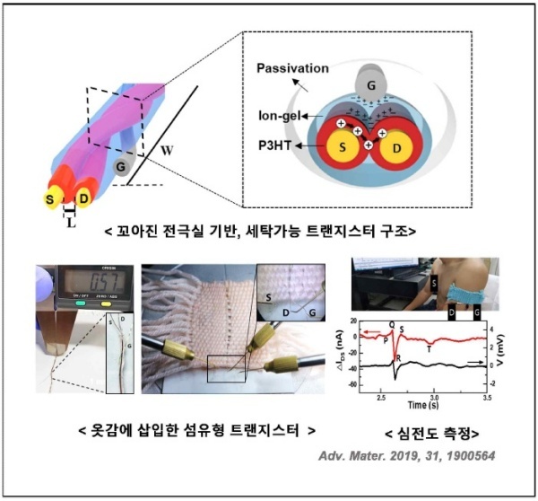 ▲ 트랜지스터 구조 및 섬유형 트랜지스터, 심전도 측정 등 [출처=한국과학기술연구원]