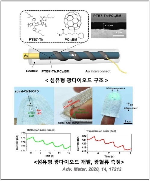 ▲ 섬유형 광다이오드 구조 및 광혈류 측정 등 [출처=한국과학기술연구원]
