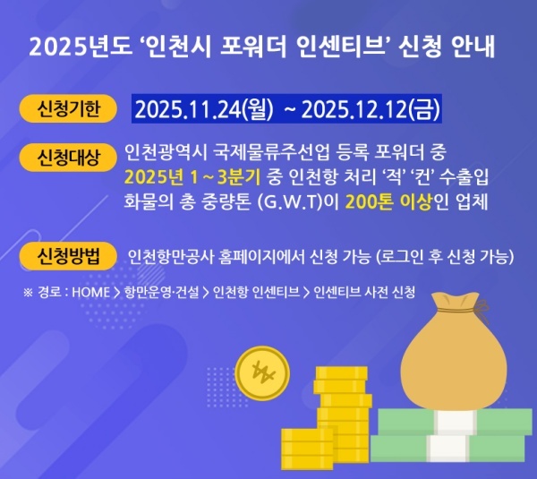 인천항만공사(사장 이경규, 이하 IPA)에 따르면 2025년 12월12일(금)까지 인천시광역시(시장 유정복)와 ‘2025년도 인천시 포워더 인센티브’ 지원기업을 모집한다.