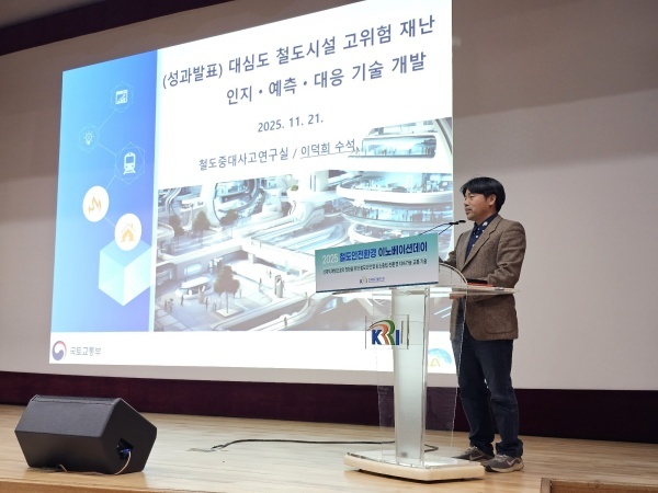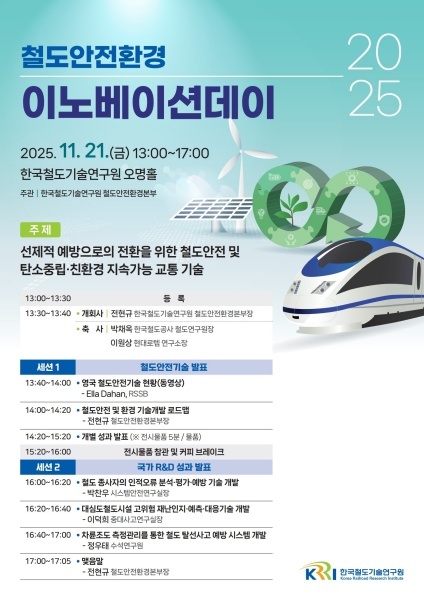 한국철도기술연구원(이하 철도연, 원장 사공명)따르면 2025년 11월21일(금) 철도연 의왕본원 대강당(오명홀)에서 철도교통분야 ‘안전’과 ‘환경’을 위한 연구개발 성과, 기술로드맵을 발표하는 「철도안전환경 이노베이션데이 2025」를 개최했다.