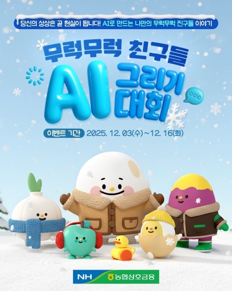 농협중앙회(회장 강호동)에 따르면 농협상호금융(대표이사 여영현)이 2025년 12월3일(수)부터 16일(화)까지 2주간 대표 캐릭터 ‘무럭무럭 친구들’을 주제로 한 「무럭무럭 친구들 AI 그리기 대회」 이벤트를 진행한다.