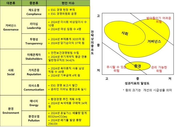 2025년 추진방향은 ‘ESG경영 내실 확립과 내외부 체감 제고’로 정했다. 내실 확립과 내외부 체감 제고를 위한 전략과제 19개를 수립했다.