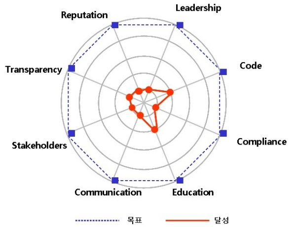 지금까지 진단한 내용을 바탕으로 ‘8-Flag Model’로 측정한 근로복지공단 윤리경영 성취도를 종합하면 위의 그림과 같다.