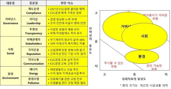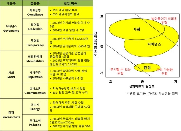 △거버넌스(Governance·지배구조)=거버넌스는 ESG 헌장은 제정하지 않았으며 ESG 위원회를 구성해 운영 중이지만 개선의 시급성이 가장 크다고 평가했다.