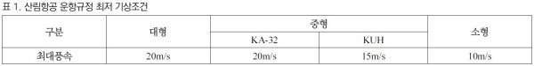 산림청 산림항공 운영규정에 따르면 소형 항공기의 경우 10m/s 이상의 풍속에서 비행이 제한된다. 항공기별 비행제한 풍속은 표 1과 같다.