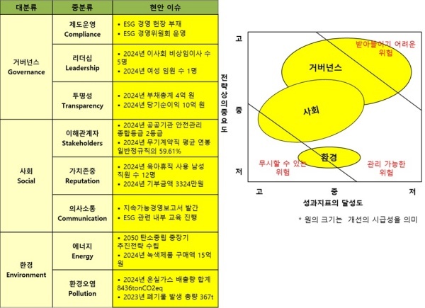 △거버넌스(Governance·지배구조)=거버넌스는 ESG경영위원회는 구성하고 다양한 추진 임무를 제시했지만 구체적인 성과는 미진해 개선이 시급하다고 평가했다.