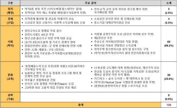 사회(복지) 공약이 전체의 69.2%를 차지했으며 다음으로 △문화(교육) 공약 25.0% △경제(산업) 공약 3.3% △정치(행정) 공약 2.5%‘ △과학(기술) 공약 0.0%를 각각 기록했다.