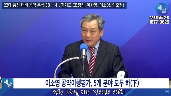 2024년01월23일(화요일) 새날 유튜브 방송은 2020년 21대 국회의원 선거에서 당선된 경기도 의왕시·과천시 이소영 의원이 제시한 선거공약을 평가했다. 평가를 위한 방송에는 푸른나무, 이상구 원장, 민진규 소장(국가정보전략연구소)이 출연했다.