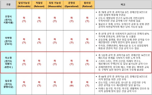 이 의원이 제시한 37개 공약은 경기도 군포시 이학영 의원과 마찬가지로 달성가능성 △적절성 △측정가능성 △운영성 △합리성 등 5개 영역 최하인 하(下) 평점을 받았다.