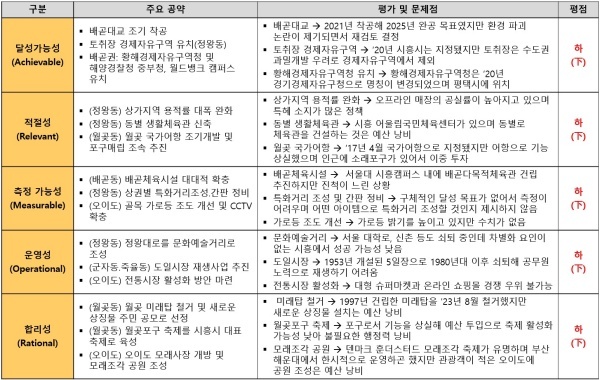 조 의원이 제시한 78개 공약은 △달성가능성 △적절성 △측정가능성 △운영성 △합리성 등 5개 영역에서 모두 최하인 하(下) 평점을 받았다.