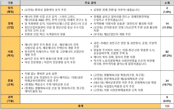 다음으로 △경제(산업) 공약 18.9% △정치(행정) 공약 5.4% △과학(기술) 공약 5.4% △문화(교육) 공약 2.7%를 각각 기록했다.
