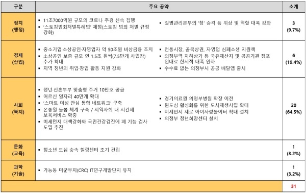 31개 공약은 정치행정(3)·경제산업(6)·사회복지(20)·문화교육(1)·과학기술(1)로 구성