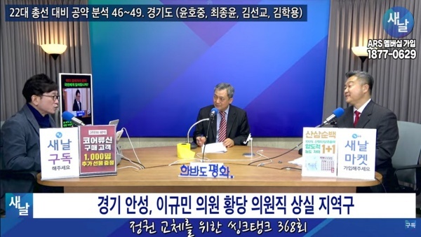 2024년02월06일(화요일) 새날 유튜브 방송은 2020년 21대 국회의원 선거에서 당선된 경기도 안성시 김학용 의원이 제시한 선거공약을 평가했다. 평가를 위한 방송에는 푸른나무, 이상구 원장, 민진규 소장(국가정보전략연구소)이 출연했다.