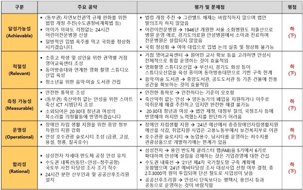 ▲ 경기도 안성시 김학용 의원 공약 평가 결과(달성가능성/적절성/측정가능성/운영성/합리성) [출처=국가정보전략연구소(iNIS)]
