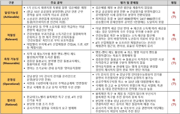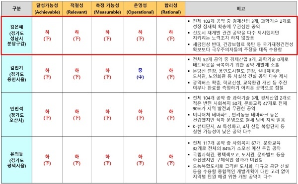 김 의원이 제시한 103개 공약은 △달성가능성 △적절성 △측정가능성 △운영성 △합리성 등 5개 영역 모두 최하인 하(下) 평점을 받았다.