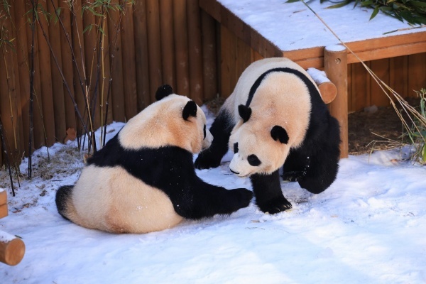 ▲ 에버랜드, 눈 덮인 ‘판다 세컨하우스’에서 즐거운 시간을 보내는 루이바오(좌)와 후이바오(우) [출처=삼성물산]