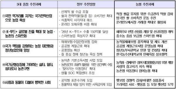 정부의 농정 대전환은 2025년 9월 확정된 새 정부 국정과제와 최근 농림축산식품부 업무보고를 통해 발표된 5대 중점과제다. 농업·농촌의 지속 가능한 미래를 여는 핵심 정책이다.