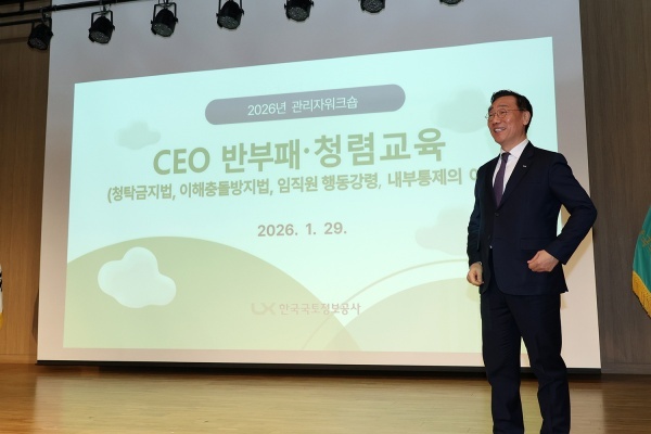 ▲ 한국국토정보공사, 1월29일(목) 진행된 ‘2026년 반부패ㆍ청렴 선포식’에서 어명소 사장의 반부패ㆍ청렴교육과 반부패ㆍ청렴 선언문 낭독 등 고강도 반부패 실천 의지를 다졌다 [출처=한국국토정보공사]