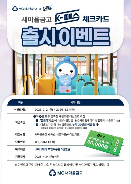 이벤트 응모자 중 새마을금고 K-패스 체크카드로 누적 30만 원 이상 결제한 고객 1000명을 대상으로 추첨을 통해 네이버페이 포인트 쿠폰 3만 원권을 지급할 예정이다. 이벤트 응모하기는 가까운 새마을금고, MG더뱅킹(앱), MG카드홈페이지에서 가능하다.