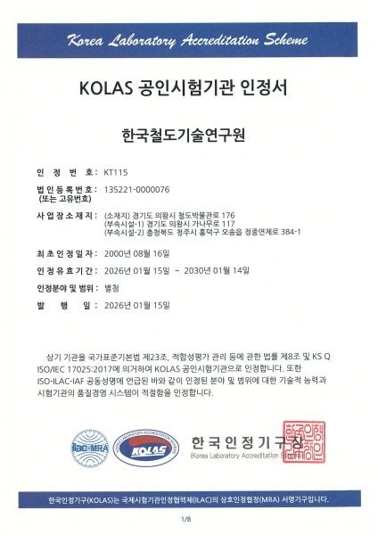 한국철도기술연구원(이하 철도연, 원장 사공명)에 따르면 철도 안전과 품질 확보를 위한 국제공인시험기관 자격을 성공적으로 갱신했다. 한국인정기구(KOLAS, Korea Laboratory Accreditation Scheme)의 4년 주기 재평가를 통한 결과다.