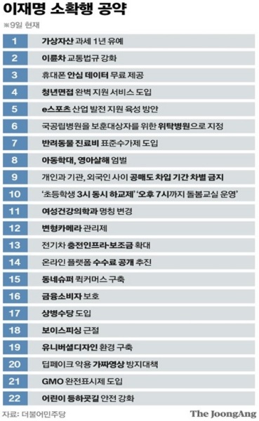 - 이재명 경선 캠프 시절에 취합된 공약이 500여개, 민주당 정책위원회에서 정리된 공약이 600개, 그리고 민주당의 민주정책연구원에서 만든 공약과 각 지역별 공약을 합하면 수천개가 되므로 이를 정리하는 것이 보통일이 아닙니다. 그래서 계속해서 이재명의 페이스북을 통해 발표하는 <소확행> 공약의 이면에는, 복잡다단한 논의 구조에 대한 여당 선대위의 고민이 있다고 합니다.