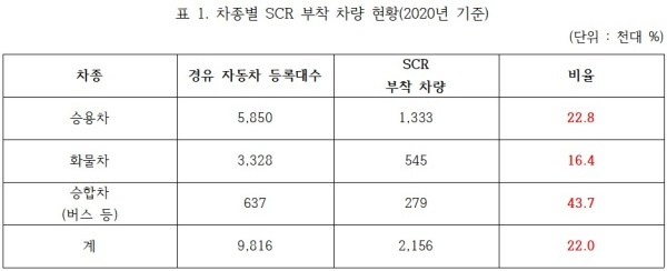 - 그렇습니다. 요소수 공급난으로 화물자동차의 운행 정지나 물류대란에 대한 우려가 크지만, 버스 등 승합차의 SCR 부착 비율이 더 높아 요소수 공급 중단은 버스의 운행난과 함께 일상적 여객 교통에 막대한 지장을 줄 수 있습니다.