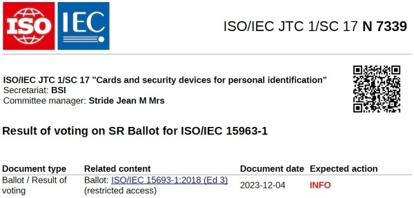 2023년 12월04일 ISO/IEC 공동기술위원회 산하 분과위원회 SC 17은 'Result of voting on SR Ballot for ISO/IEC 15963-1(N 7339)' 문서를 배포했다.