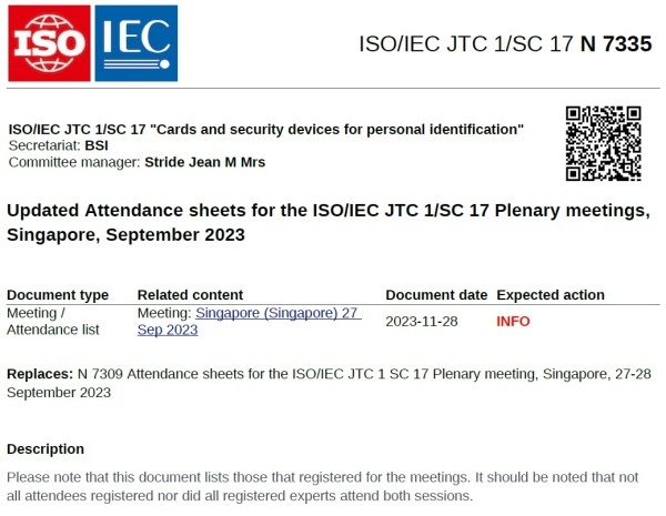 2023년 11월30일 ISO/IEC 공동기술위원회 산하 분과위원회 SC 17은 'Updated Attendance sheets for the ISO/IEC JTC 1/SC 17 Plenary meetings,Singapore, September 2023'에 관련된 문서를 배포했다.