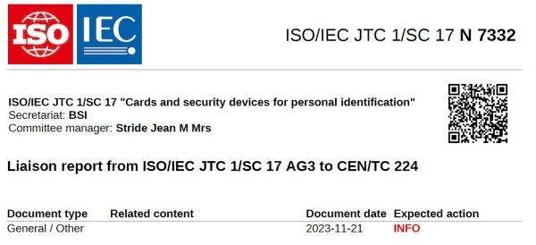 2023년 11월21일 ISO/IEC 공동기술위원회 산하 분과위원회 SC 17은 'Liaison report from ISO/IEC JTC 1/SC 17 AG3 to CEN/TC 224' 관련된 문서를 배포했다.