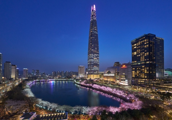 ▲ 벚꽃 명소로 사랑받는 석촌호수와 롯데월드타워 전경 [출처=롯데물산]