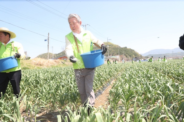 ▲ 강호동 농협중앙회장이 13일 경남 새남부농협 농가에서 ‘2026 범농협 영농지원 전국 동시 발대식’의 일환으로 비료 살포 등 영농지원 활동을 하고 있다 [출처=농협중앙회]