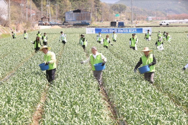 ▲ 13일 경남 새남부농협 농가에서 열린 ‘2026 범농협 영농지원 전국 동시 발대식’ 이후 범농협 임직원과 자원봉사자들이 마늘밭 일손돕기 활동을 하고 있다 [출처=농협중앙회]
