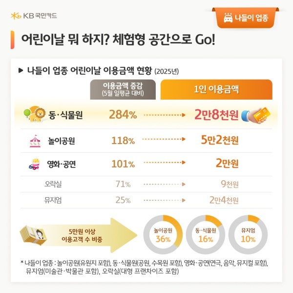 ▲ (나들이 업종) 어린이 날, 동식물원, 놀이공원, 영화/공연, 오락실 등에서 즐겨 [출처=KB국민카드]