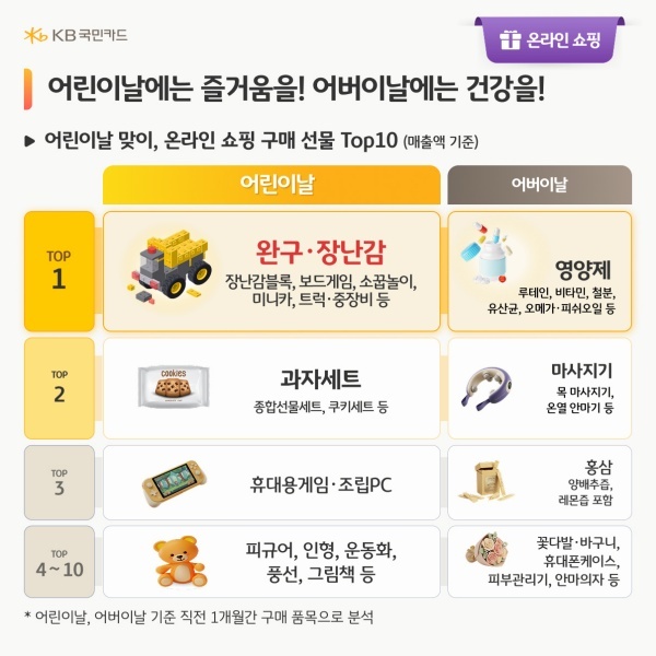 ▲ (선물) 어린이 날 맞이, 온라인에서 구매하는 선물은 완구/장난감, 과자세트, 휴대용게임/조립PC 등 [출처=KB국민카드]