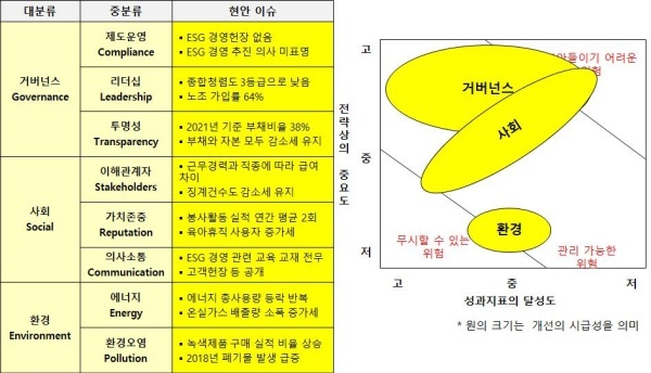 △거버넌스(Governance·지배구조)=ESG 경영헌장을 제정하지 않았으며 ESG 경영을 추진하겠다는 의사도 공개적으로 표명하지 않았다. 종합청렴도는 2018년 3등급으로 하락한 이후 유지되고 있어 개선이 필요하다. 부채비율이 낮지만 부채와 자본 모두 감소세로 경혁 혁신을 통해 부채를 줄여야 한다.