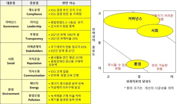 △거버넌스(Governance·지배구조)=지난해 9월 ESG추진단을 신설한 후 ESG위원회·ESG자문위원회 등을 구성한 점은 긍정적이다. 하지만 ESG 경영과 관련된 헌장 제정이나 선언문 등이 없어 실천 의지가 있는지 의심된다. 지난 5년간 종합청렴도는 2~3등급에서 벗어나지 못해 획기적인 조치가 필요한 실정이다. 부채비율은 하락하고 있으나 자본금 증액에 따른 착시효과에 불과하다.