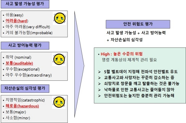 안전 위험도 평가 고속버스의 안전을 종합적으로 진단하면 운전사의 졸음운전, 난폭운전, 안전거리 미확보, 승객의 방어능력 취약, 고속으로 인해 승객상해 위험도 상승 등으로 인해 높은 수준의 위험이 있다고 볼 수 있다.