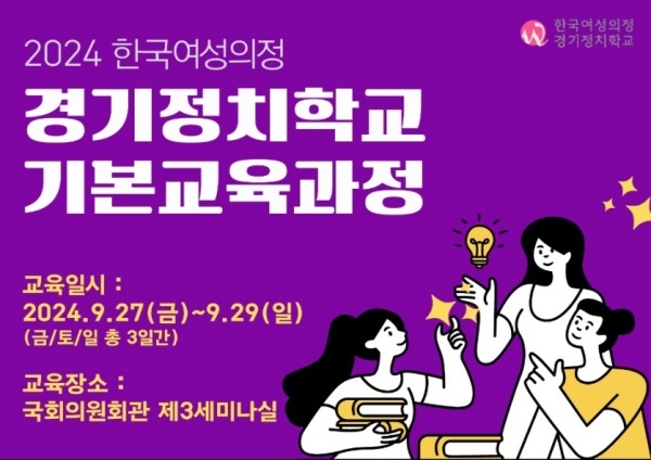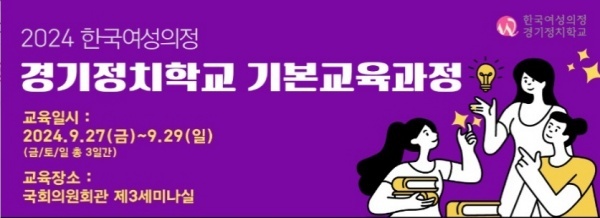 한국여성의정(상임대표 이혜훈) 경기정치학교(교장 김현아)에 따르면 2024년9월27일(금)~9월29일까지 3일간 국회의원회관 제2소회의실에서 기본교육과정을 개최한다.