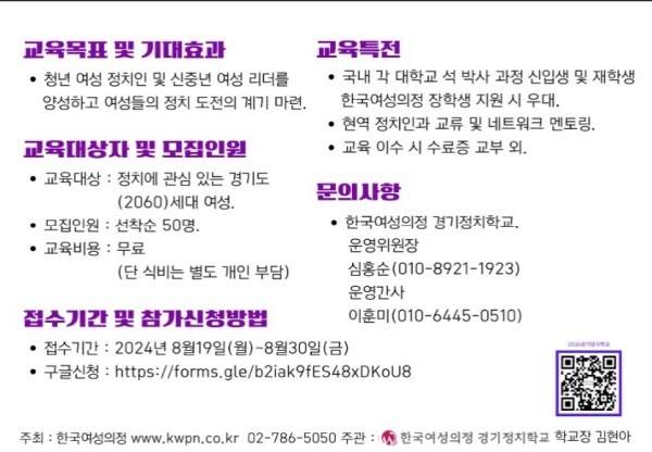 경정치학교 기본교육과정은 (사)한국여성의정이 주최하고 한국여성의정 경기정치학교가 주관해 정치에 관심이 있는 경기도 2060세대 여성들을 대상으로 선착순 50명을 모집해 무료 교육을 진행한다.