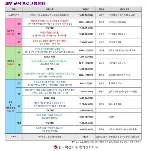 ▲ 경기정치학교 기본교육과정 안내[출처=한국여성의정]