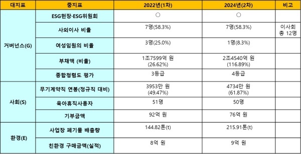 다만 무기계약직의 급여를 정규직 수준으로 끌어올리기 위해 노력한 흔적은 긍정적이다. 봉사활동이 2019년 이후 감소했는데 코로나19 팬데믹 기간이라는 점을 고려해도 너무 적다. ESG 교육도 이행하지 않고 있다.