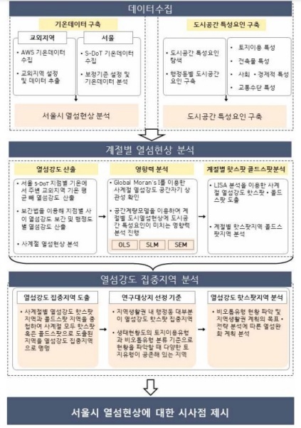 이를 위해 서울의 도시데이터센서(S-DoT) 기온 데이터와 도시공간 특성 요소를 수집하고 사계절 열섬강도를 산출함으로써 도시공간 특성요인 영향력을 분석한다.